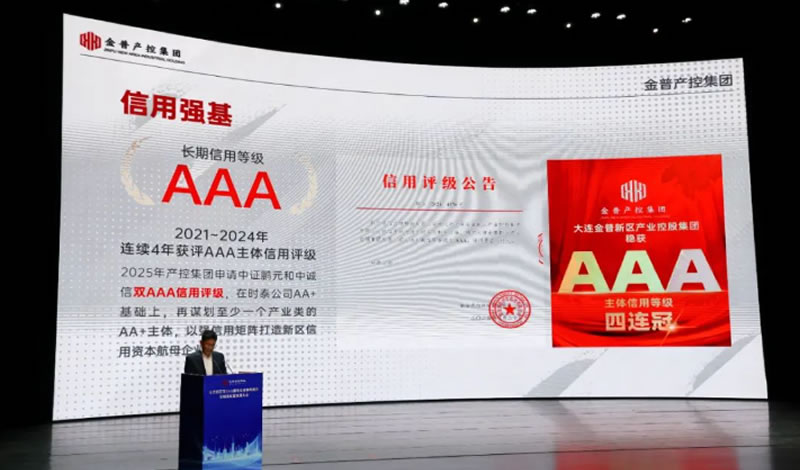 2024年12月25日,经中证鹏元资信评估股份有限公司评定,产控集团主体信用等级为AAA,评级展望为稳定。2025年3月11日,经中诚信国际信用评级有限责任公司评定,产控集团主体信用等级为AAA,评级展望为稳定。至此,金普产控集团成为拥有双AAA主体信用评级的东北区域唯一区县级国有企业,充分体现了权威评级机构对金普新区、大连市乃至对东北地区高质量发展的高度认可。
